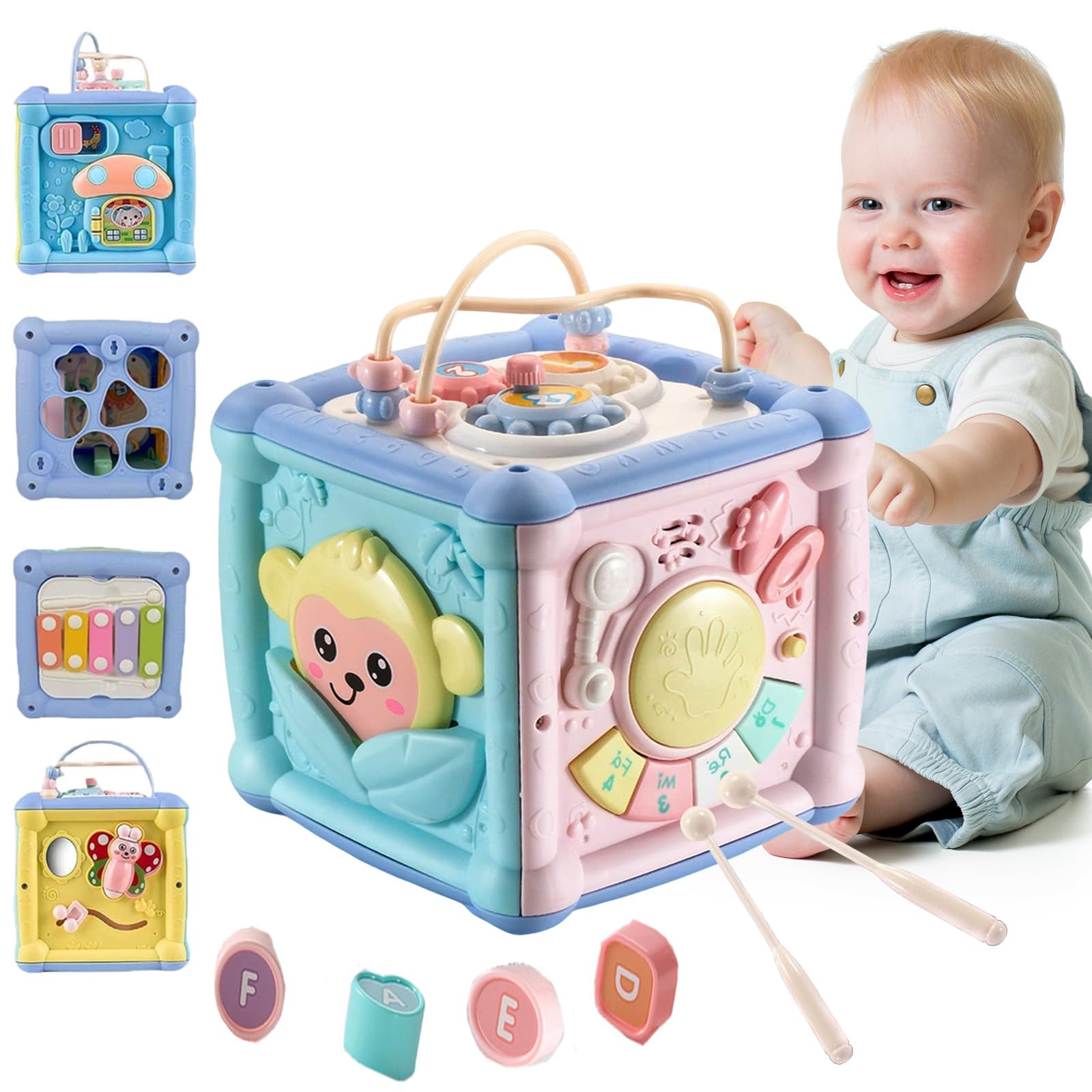 - 【7-in-1 Activity Cube】Caossuixin baby activity cube features 7 distinct play surfaces, including a shape sorter, rotating gears, joyful drumming, piano keys, bead maze, musical instruments, and animal interactions. Each activity develops sensory skills, mathematical reasoning, animal recognition, and hand-eye coordination.Designed to encourage independent exploration and cognitive growth, this montessori toys is suitable for boys and girls aged 1 to 3 years.