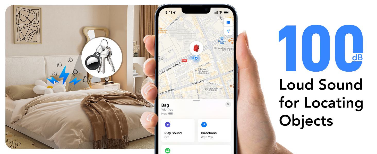 【Easily Track Your Belongings with iOS Find My】 The key finder (4-Pack) work with Apple's Find My app to effortlessly track your valuables without any subscription fees. The luggage tracker features a built-in speaker (up to 100dB) that can be triggered within Bluetooth range (60 meters/200 feet), helping you locate items easily—even if they're hidden under cushions or buried deep in a bag. When out of range, leverage Apple's Find My network of billions of devices to pinpoint the last known location, even if you're far from home.