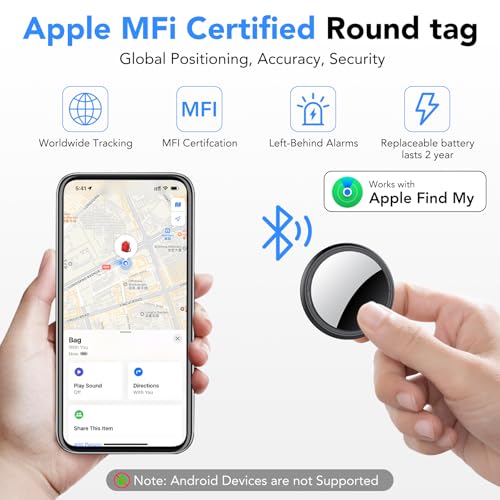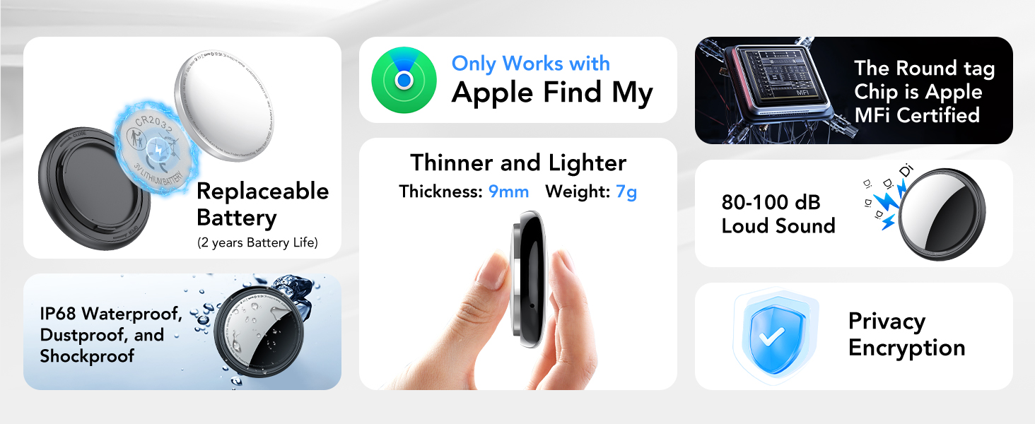 【Protect Your Privacy, Easy Setup】This tracker tag's chip is MFi-certified, ensuring all communications with the Find My network are anonymous and encrypted to safeguard your privacy. Location data and history are never stored on the tracker tag, guaranteeing your location data remains encrypted from anyone—even the manufacturer. How to set up? Simply open the Find My app and enable Bluetooth. Add your item to the “Round tag” tab to complete pairing in under 30 seconds.