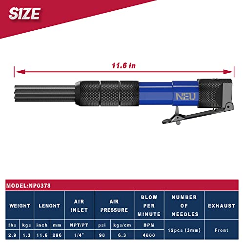 【Professional】Size: 295mm (including needle), Weight: 1.3kg, Number of needles: 12, Needle size: 3.2mm (dia.) x 180 mm (length), Blow speed at zero load: 4000 bpm, Working air pressure: 0.62 MPa, Compressed air connection: 1/4".