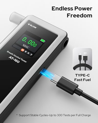 AT-160 is a portable breathalyzer. The size of the palm and weight of only 74g make it easy to put into a pocket or a storage compartment in the car; it is equipped with a USB-C charging port and a charging cable, which can be adapted to most power interfaces, and can meet the requirements of in-car charging, indoor charging, and outdoor charging, and can be charged anytime and anywhere; it is equipped with a portable bag, which can be conveniently stored and carried in a unified manner for the alcohol tester, mouthpiece, user manual and charging cable. The blood alcohol breathalyzer with built-in storage can record the results of the last 10 tests, which is convenient for tracking and recording test results. It is convenient for users to manage their BAC anytime and anywhere.