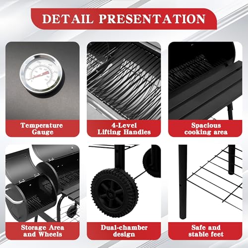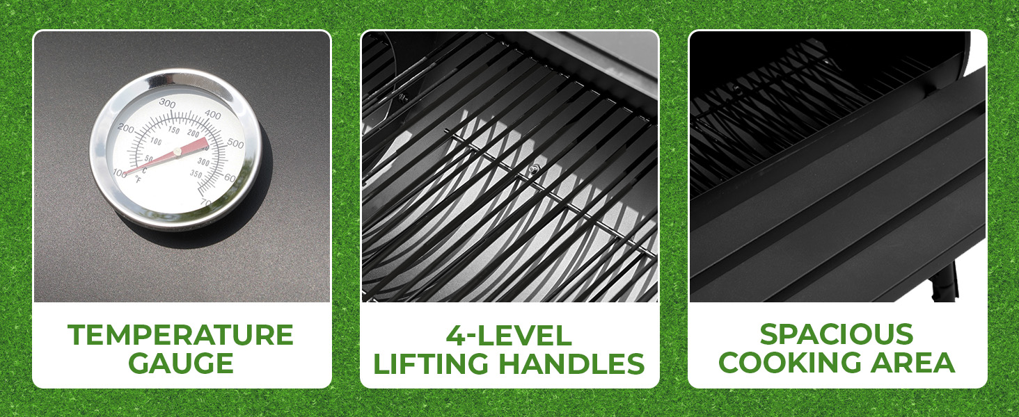 - 4-Level Adjustable Charcoal Tray: Customize charcoal height with 4-level lifting handles for better heat control and cooking flexibility.