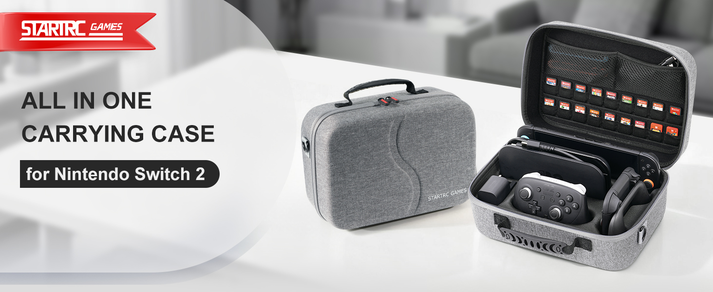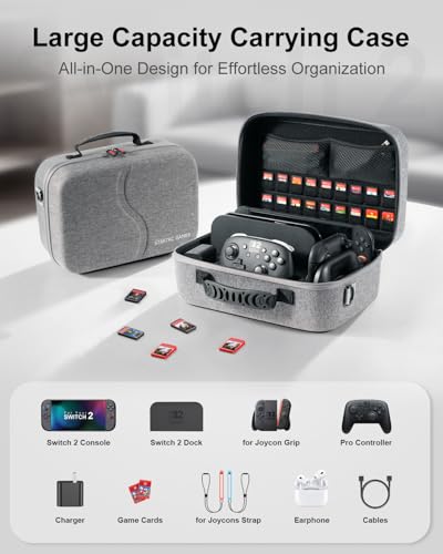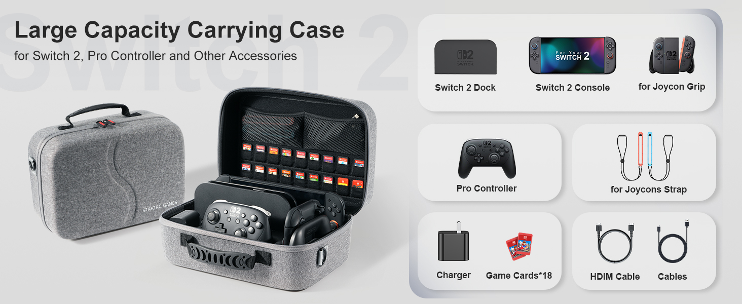 All-in-One Carrying Case: STARTRC GAMES Switch 2 carrying case easily store the essentials you need, including the Switch 2 console, Pro controller, Switch 2 dock, charger adapter, 18 game cards, cables and other accessories