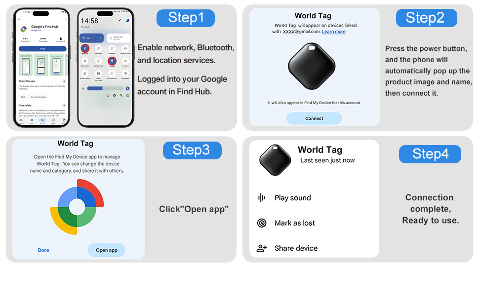 - 【Google Smart Tracker】This Google-certified Bluetooth tracker is designed for Android devices (Android only, not compatible with iOS). Works with Google's Find My Device app to locate and retrieve keys, wallets, suitcases, backpacks,etc., with replaceable batteries. (Only available for Android devices, not for iOS and HUAWEI devices)