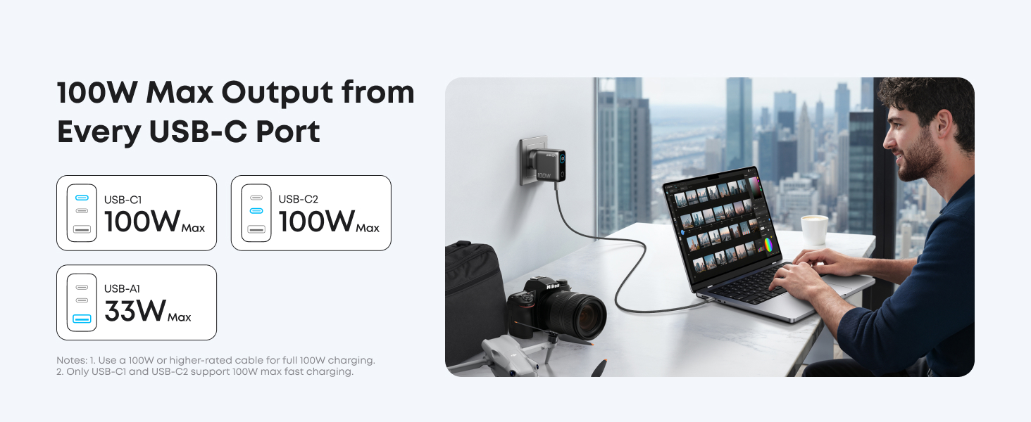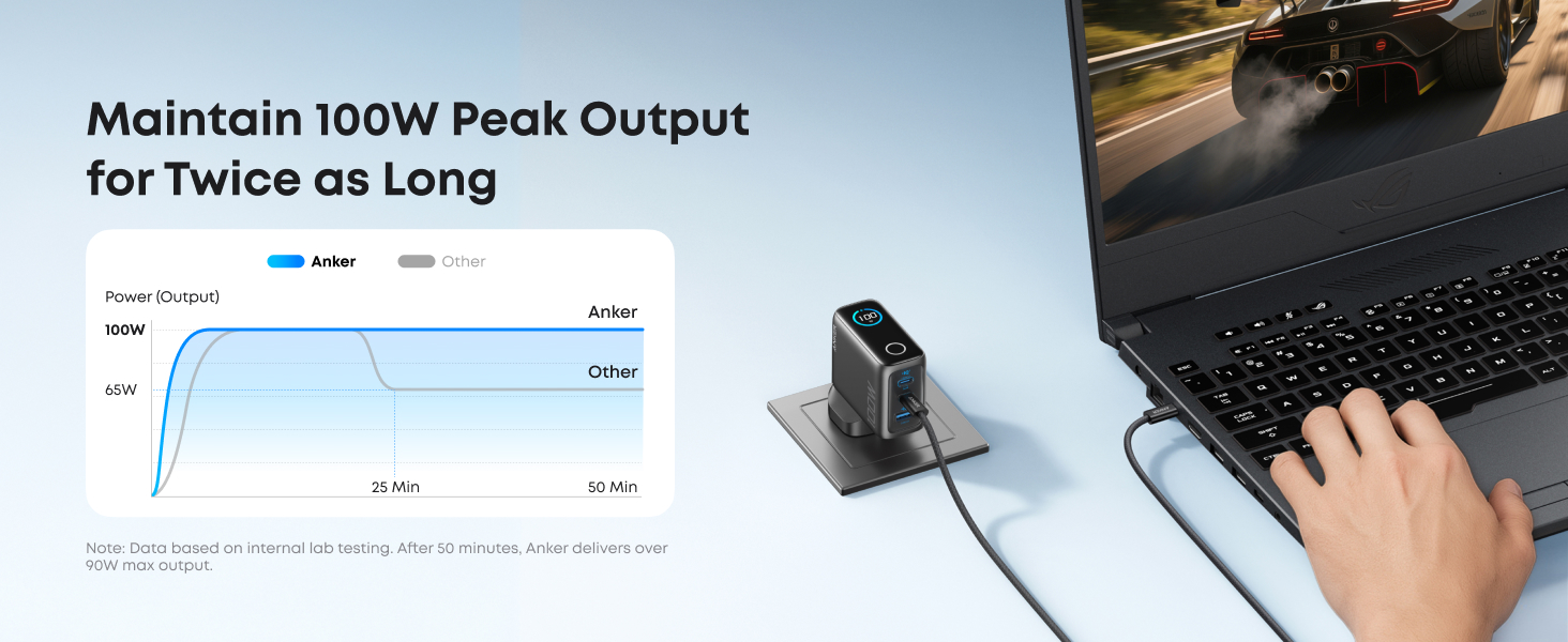 - Full-Speed 100W Max Power: Advanced GaN technology delivers a steady 100W output on any USB-C port and sustains peak performance up to twice as long compared to the average 100W charger.