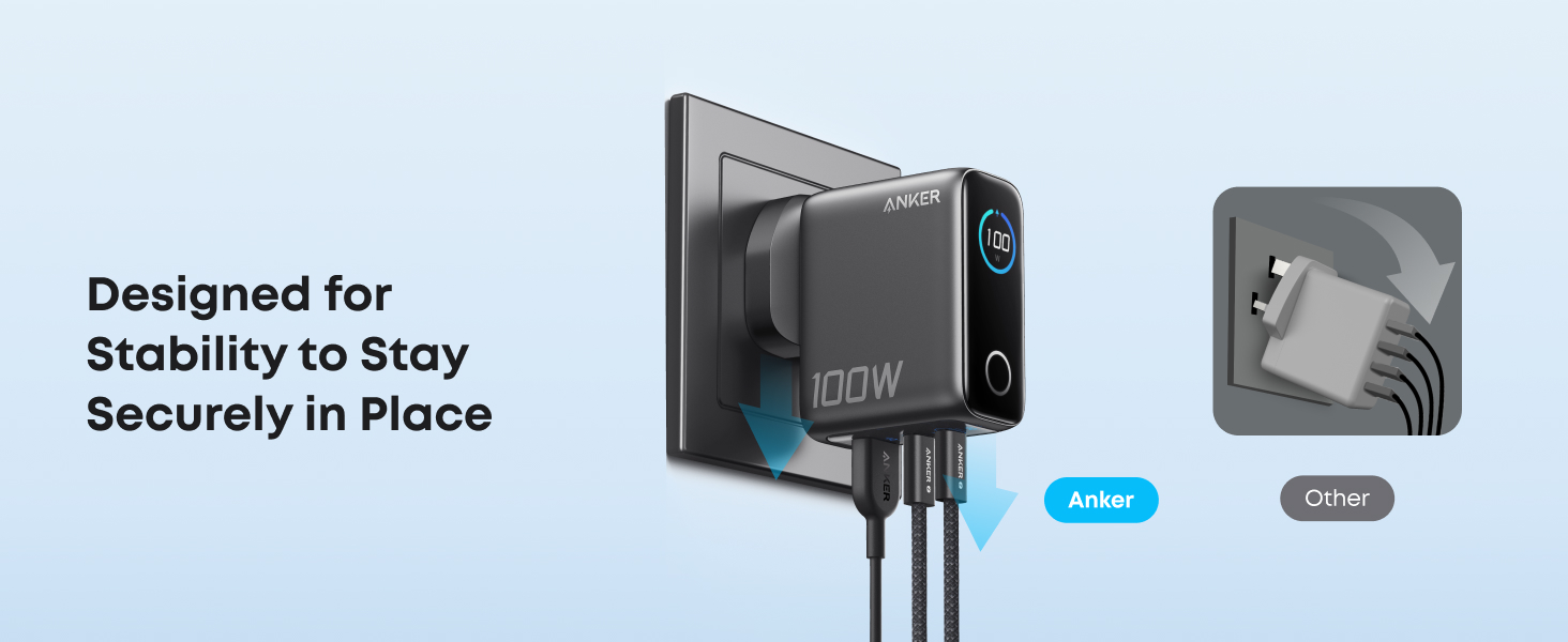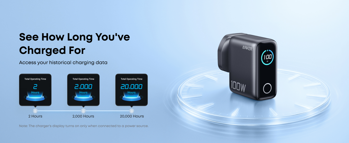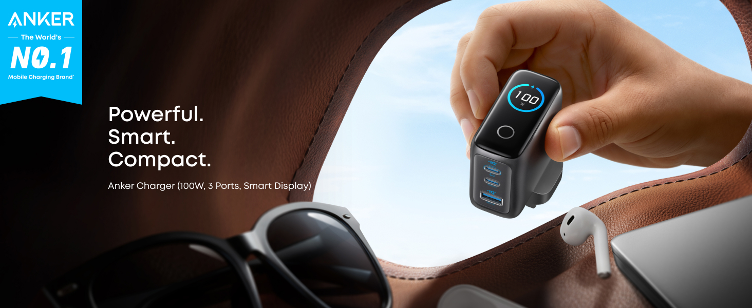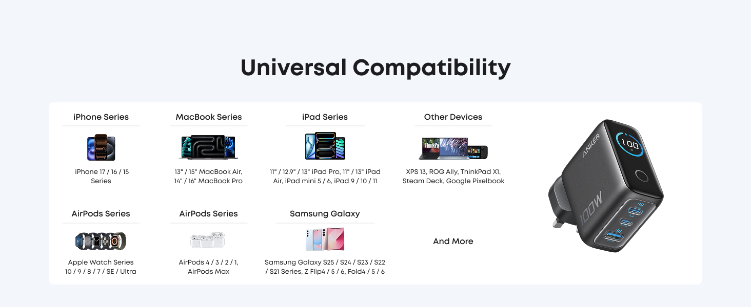 - What You Get: Anker Charger (100W, 3 Ports, Smart Display), welcome guide, 18-month warranty, and our customer support contact card.