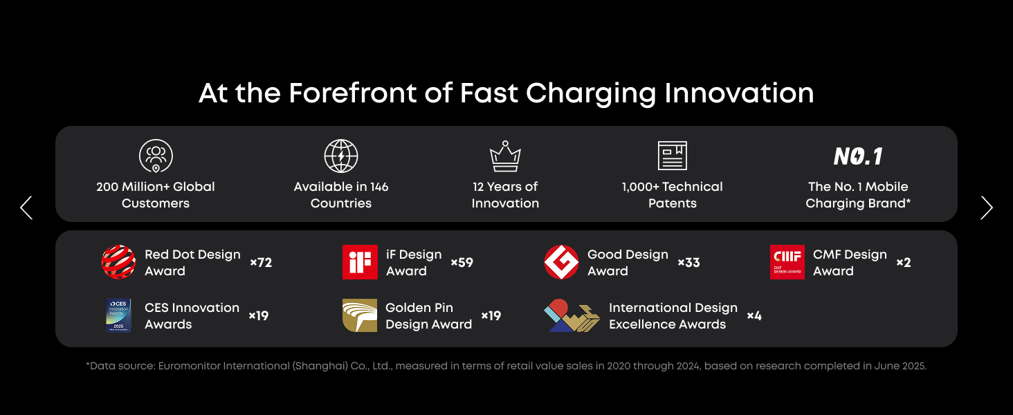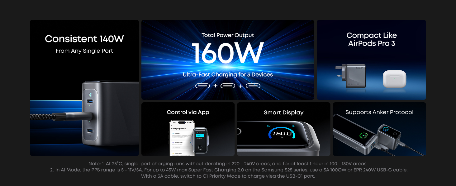 Notes3. Based on internal lab testing in AI Mode 2.0, this charger powers a 16″ MacBook Pro, iPhone 16 Pro Max, and 11″ iPad Pro from 20% to 80% in the same time as using three original chargers (140W + 35W + 35W).