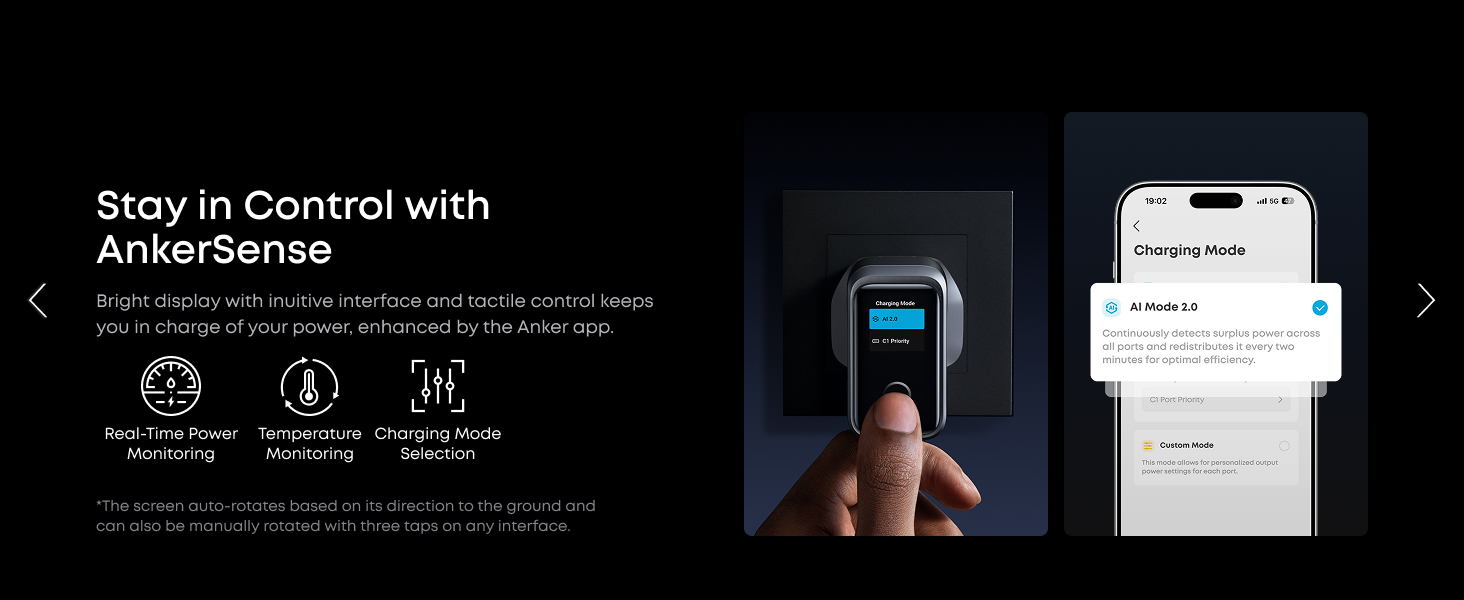 - Smarter Charging Control: With AnkerSense View, monitor power in real time on screen, switch modes instantly, and unlock custom modes through the app via Bluetooth.