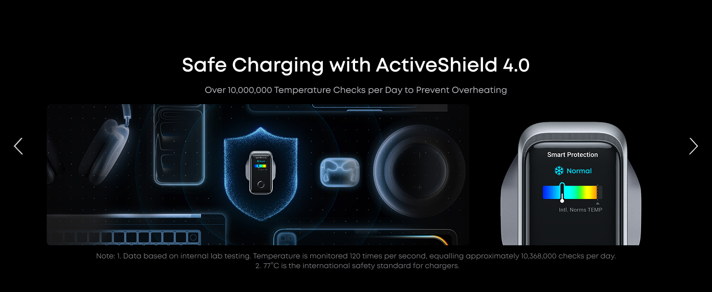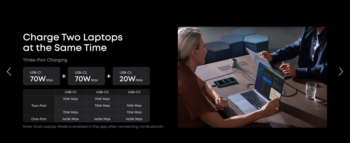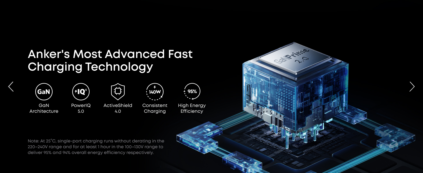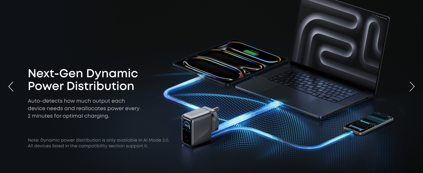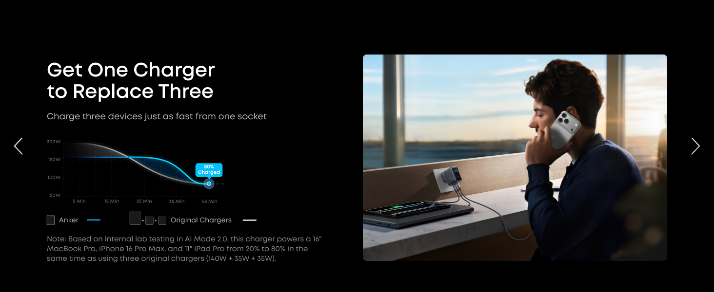 Notes3. Based on internal lab testing in AI Mode 2.0, this charger powers a 16" MacBook Pro, iPhone 16 Pro Max, and 11" iPad Pro from 20% to 80% in the same time as using three original chargers (140W + 35W + 35W).