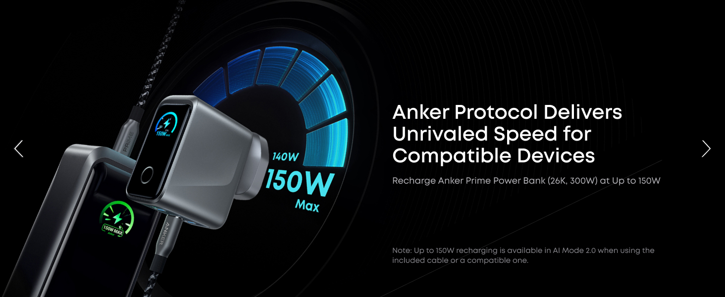 Notes2. Up to 150W recharging for Anker Prime Power Bank (26K, 300W) is available under AI Mode 2.0 when using the included cable with the power bank or a compatible one. Data based on internal lab testing. Actual performance may vary depending on specific conditions of use.