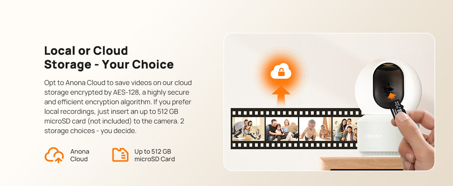 【Safer Local or Cloud Storage 】Opt to Anona Cloud to save videos on our cloud storage encrypted by AES-128, a highly secure and efficient encryption algorithm. If you prefer local recordings, just insert an up to 512 GB micro SD card (not included) to the indoor cameras for home. 2 storage choices – you decide.