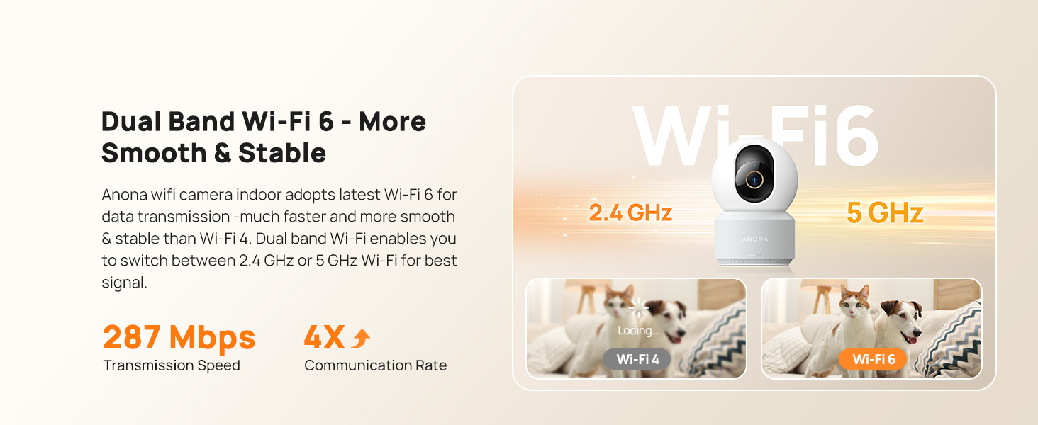 【Faster Dual-Band Wi-Fi 6 】Anona wifi cameras adopts the latest Wi-Fi 6 for data transmission – much faster and more smooth & stable than Wi-Fi 4. Dual-band Wi-Fi enables you to switch between 2.4 GHz and 5 GHz Wi-Fi for the best signal.