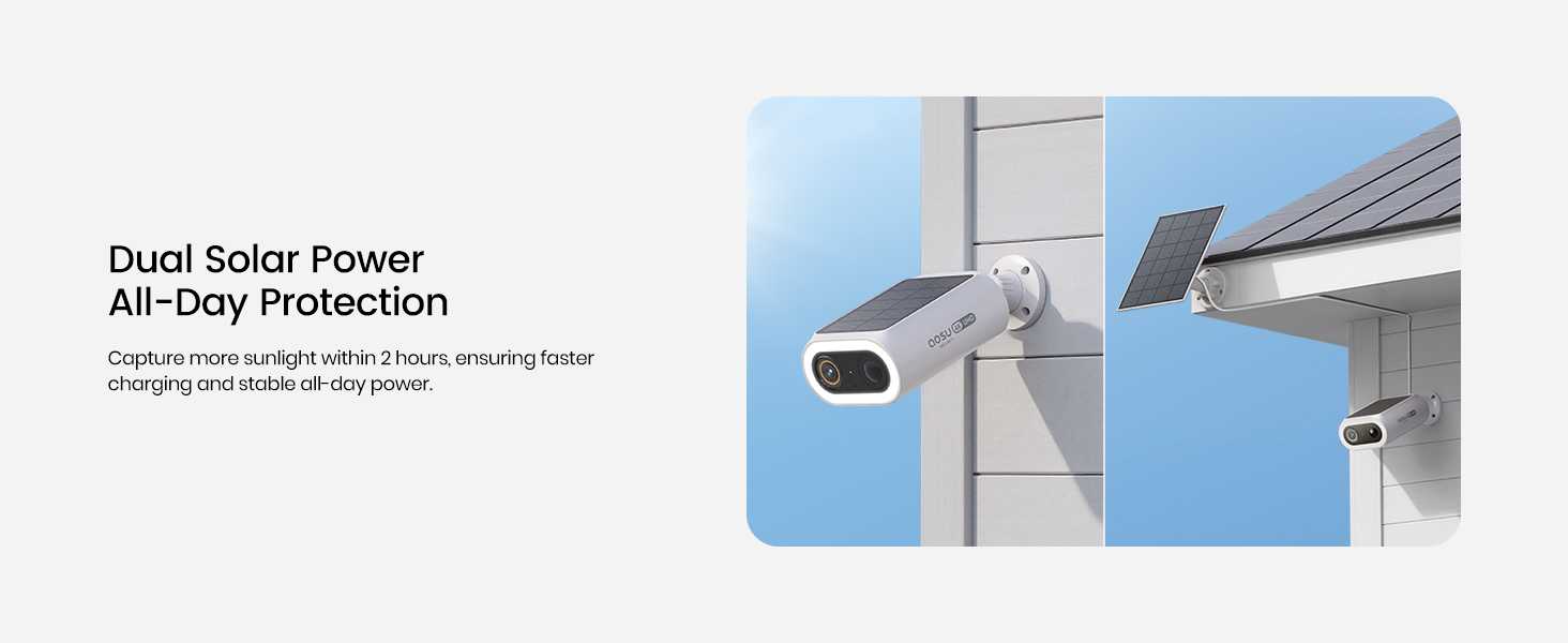 Dual solar panels provide faster charging and stable power with just 2 hours of sunlight. Even in cloudy weather, the system stays powered for year-round protection.