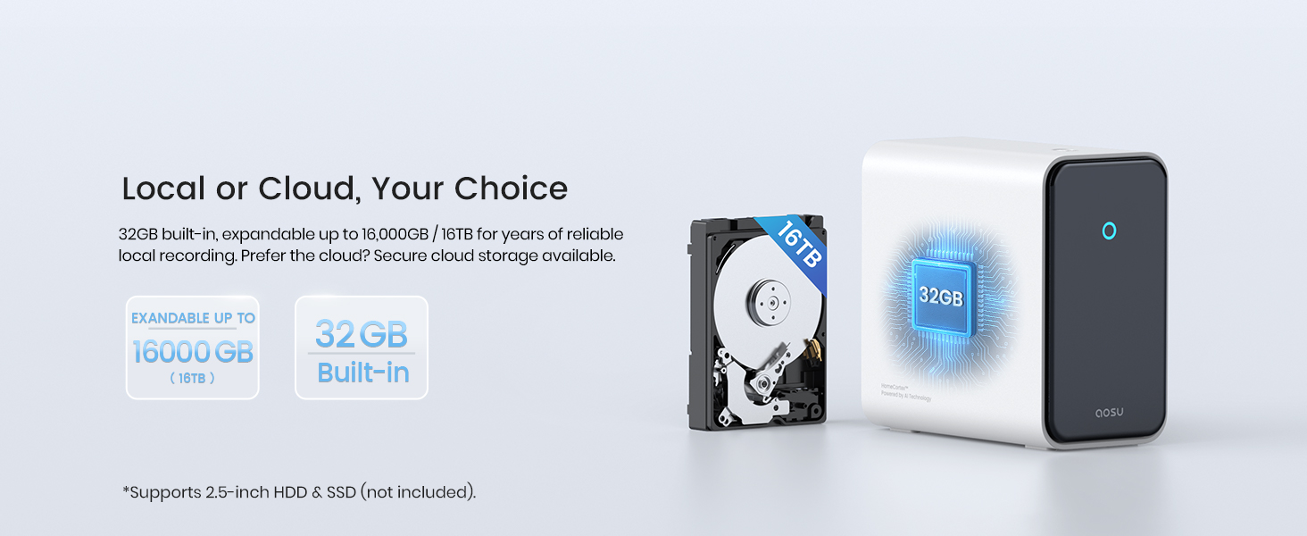 - 【Local 32 GB built-in Storage / expandable up to 16TB / Cloud Storage, all for Total Flexibility】Aosu HomeCortex Comes with 32GB built-in local storage and expandable up to 16TB—giving you full control over your data at home. For added convenience and backup, optional cloud storage is also available.