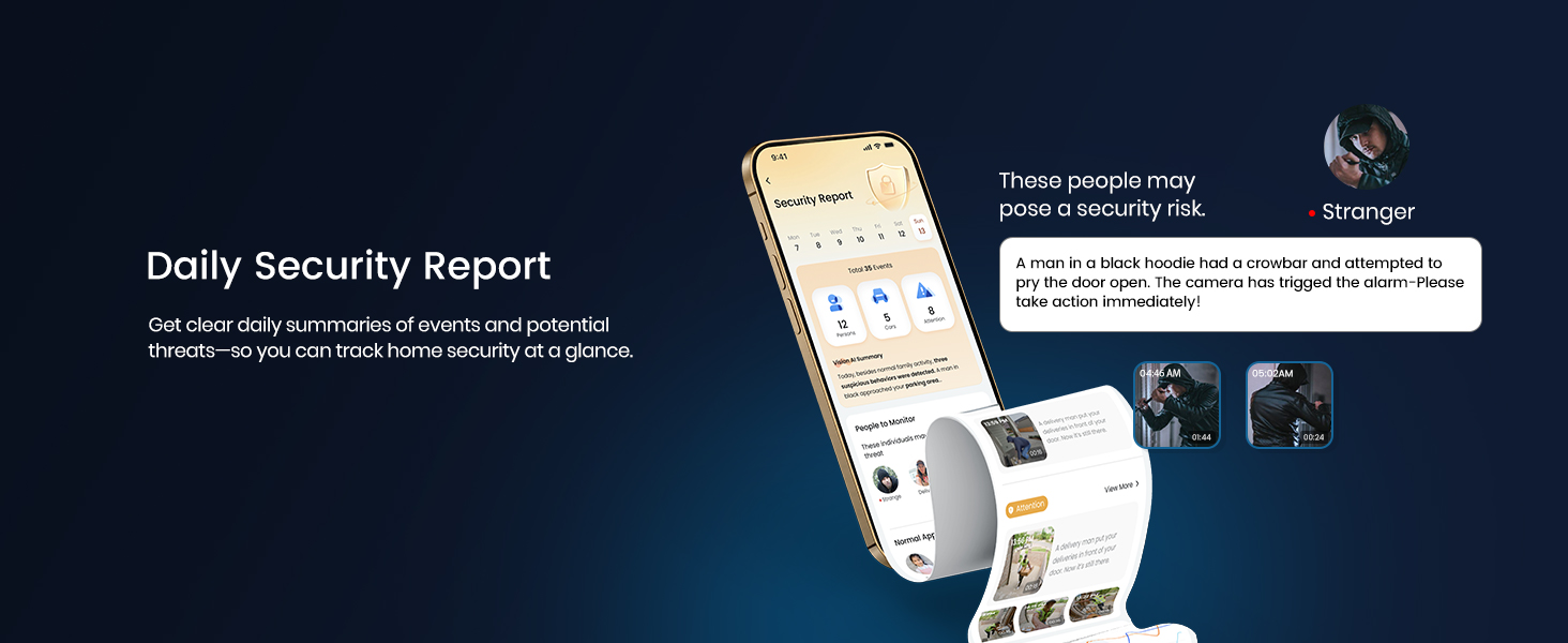 - 【AI Behavior Analysis & Smart Video Search】The system doesn’t just see—it understands. By analyzing how people move, AI identifies unfamiliar visitors even if they return in different clothes. Repeated appearances trigger alerts with risk levels. All footage is automatically sorted by people, objects, or events—making it easy to search what matters most.
