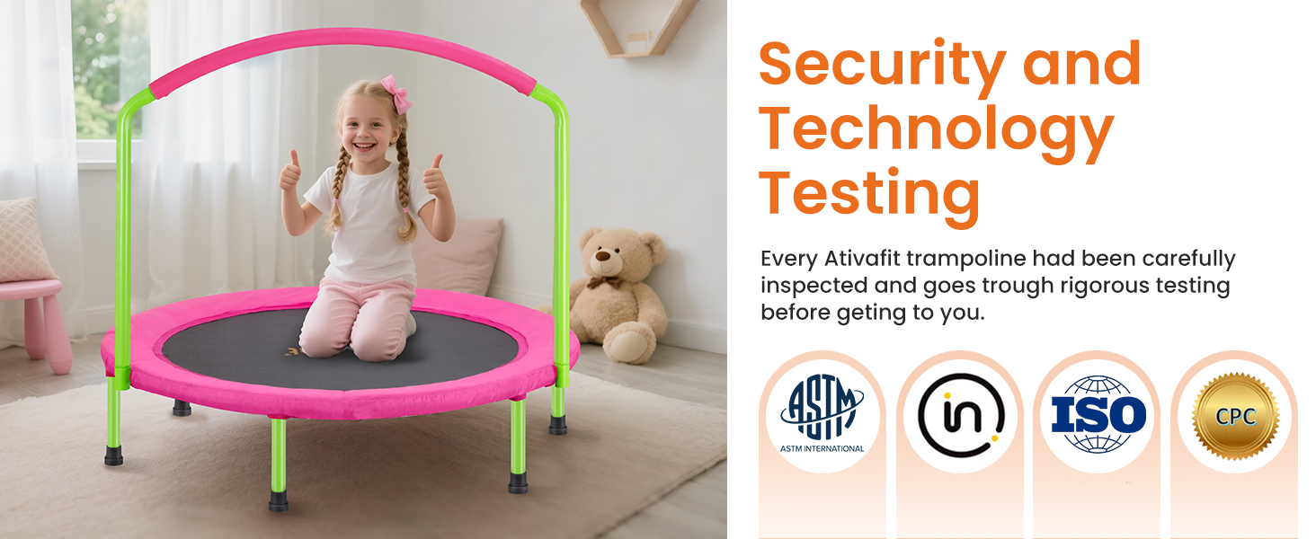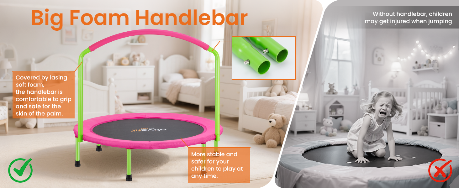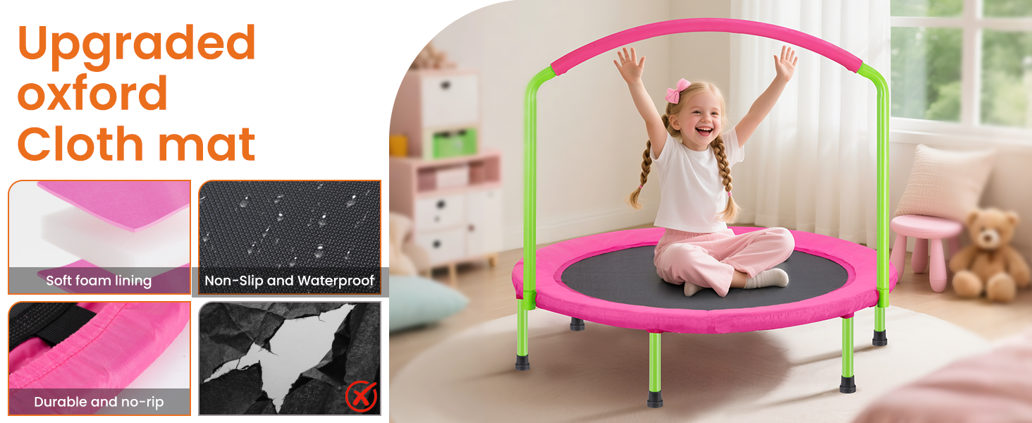 Equipped with an ultra-safe pad and foam handles, this trampoline ensures a secure and enjoyable bouncing experience for your child.The Oxford cloth padding and sturdy build guarantee long-lasting use, withstanding the energy of active kids.
