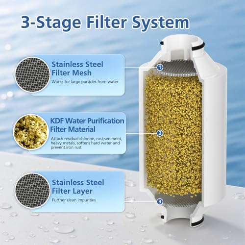 【3-in-1 Filter System】Our AWP175 Shower Filter replacement filter for philips shower filter replacement include double stainless steel filter mesh,the filter mesh above can attach large particles from water; KDF water purification filter material attach residual chlorine, rust, sediment, heavy metals, softens hard water and prevent iron rust; the filter mesh below will works for further clean impurities.