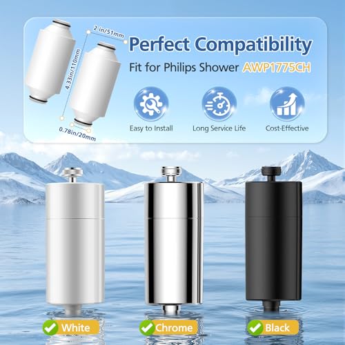 【Perfect Compatibility】The AWP175 Shower Filter Cartridge Compatible with Philips AWP1775CH Shower Chrome/Black/White, included 2 Pack Show Filter Replacement. NOTE: Please check the model fit for Philips AWP1775CH Shower before purchase.