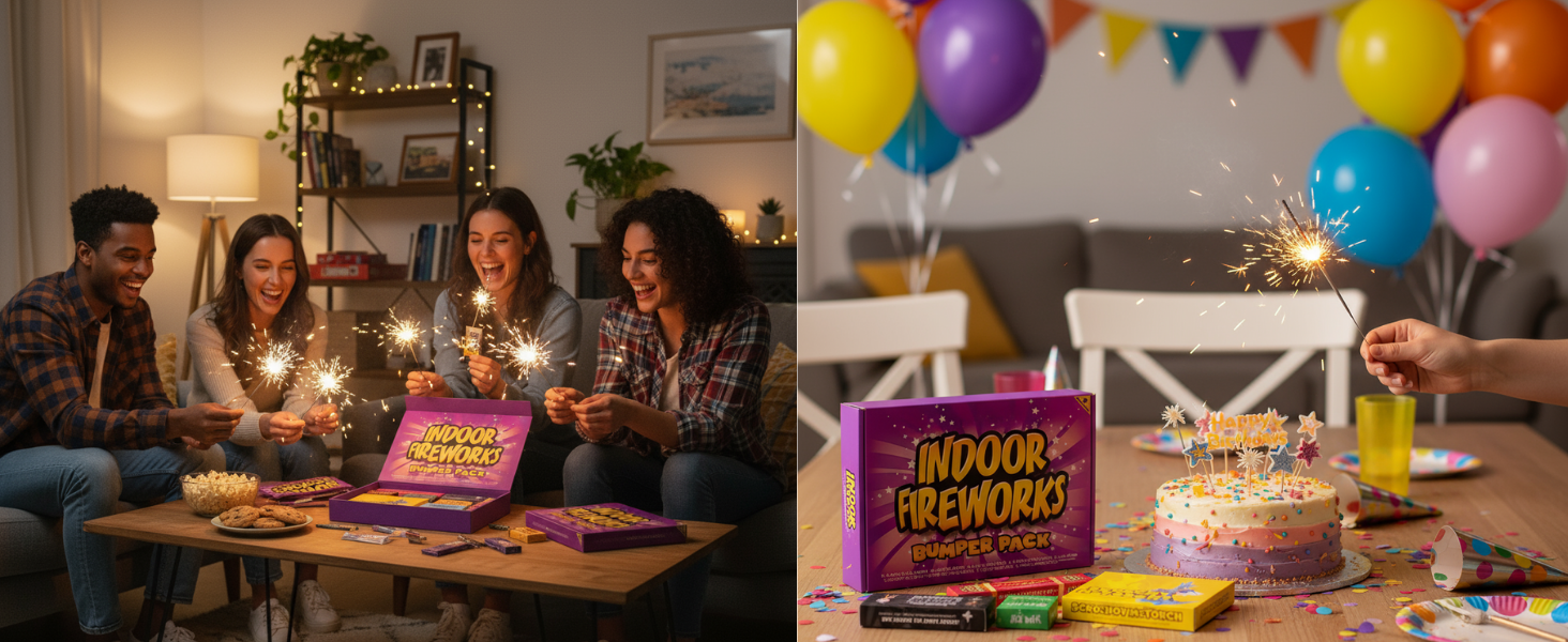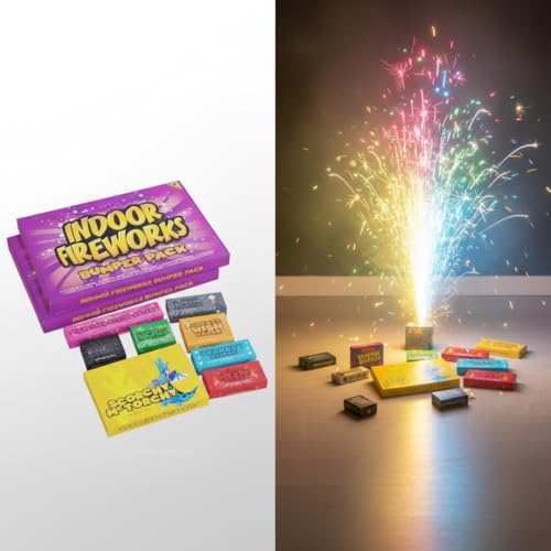 Light up your celebrations with the B4E Pack of 2 Indoor Fireworks Bumper Packs! Featuring 8 snakes, 25 fun snaps, sparklers, lava fountains, and more, this F1-rated low-hazard set is perfect for birthdays, Christmas, or New Year parties. Safe, nostalgic fun for unforgettable indoor moments.