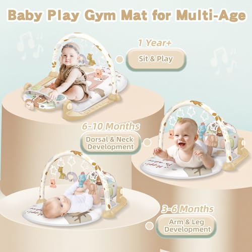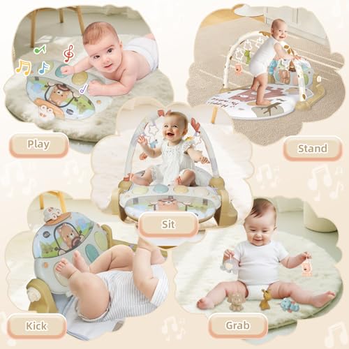 Baby Play Gym Mat 0-6 Months, Baby Activity Mat with Detachable Piano Panel and Hanging Rattles Toy, Sensory Kick and Play Piano Playmat for Babies 0-12 Months (Brown)