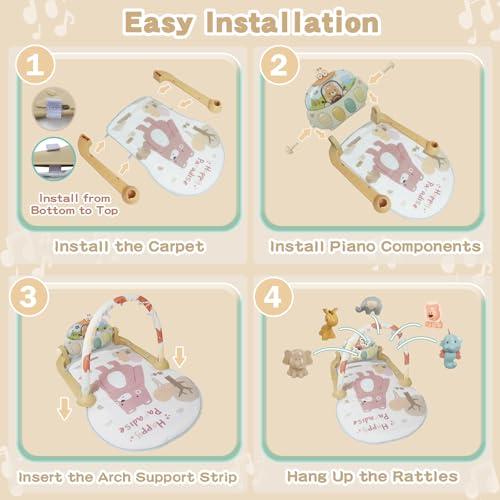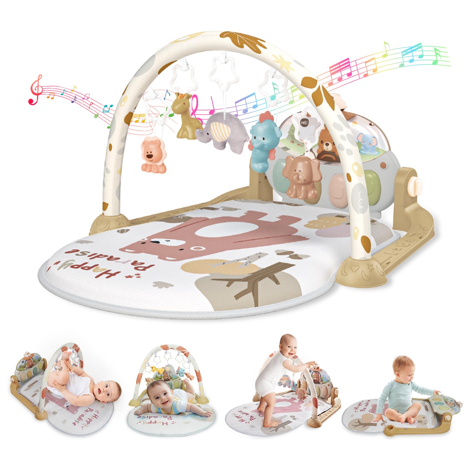 Musical Piano Panel: The gym play mat comes with a detachable and angle adjustable piano panel toy. Press the conversion button to play different music and lights (the volume is adjustable). Whether your baby presses with their hands or kicks with their feet, they can hear a variety of different sounds. Melody helps to develop baby's sense of hearing, musicality and sense of rhythm.
