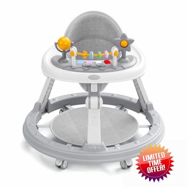 This versatile walker comes with toys for playtime, including music and sounds to keep your baby engaged. The toy can be removed to transform it into a simple dining table. It can be used for learning to walk, strolling, and playing music.