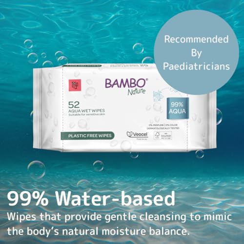 Bambo Nature Aqua Wet Wipes, 12 Packs (624 Wipes), 99% Water, Sensitive Skin Safe, Extra Soft with 100% Veocel Viscose, Irritation Free for Delicate Skin, Fragrance Free, Ideal for Daily Use