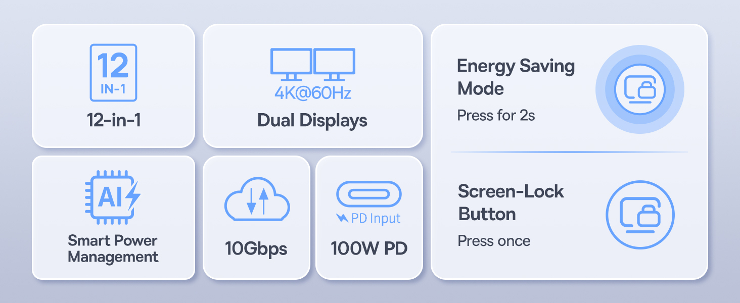 - 【Innovative Smart Energy Saving Mode】When you're out and about, simply press the top button for 2 seconds to activate this mode, and the laptop dock will intelligently disconnect all ports except the PD port, keeping your laptop charged, giving you peace of mind and long-lasting power.