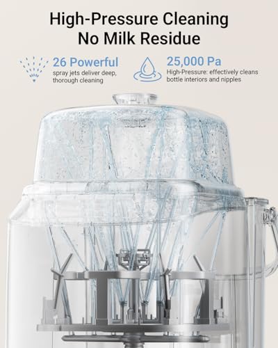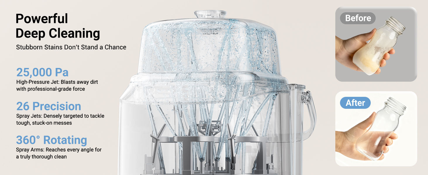 26 POWERFUL SPRAY JETS FOR FLAWLESS 360° CLEANING: With 12 precise interior spray jets and 14 swirling exterior jets, Bear’s high-pressure spray system (25,000 Pa) ensures deep cleaning of bottles, pump parts, and accessories—removing even stubborn milk residue. Uses 94.7% less water than manual washing