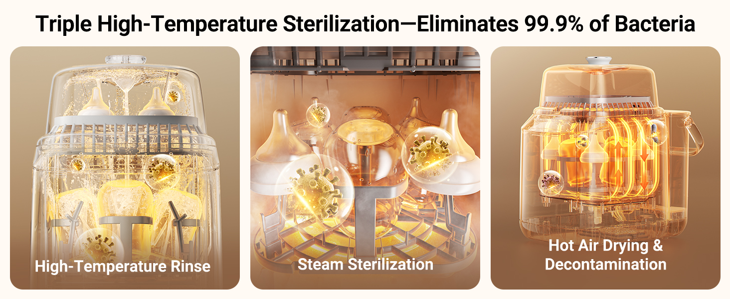 HIGH-TEMP STEAM STERILIZATION & HOT AIR DRYING: Uses 212°F (100°C) high-temperature steam to eliminate 99.99% of bacteria, followed by gentle hot air drying—ensuring every item is clean, dry, and ready to use for your little one