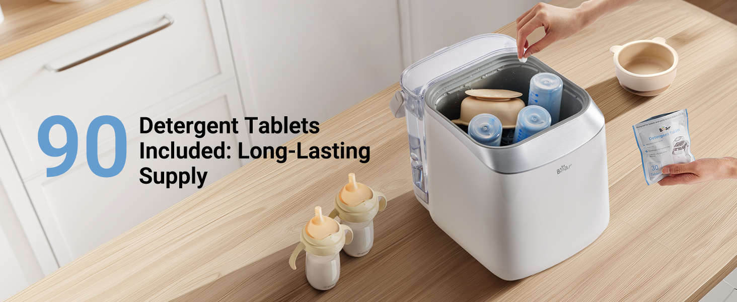 PEACE-OF-MIND SAFETY & PREMIUM INCLUDES: BPA-free construction with auto-shutoff and overheat protection; backed by a 1-year warranty. The Bear Bottle Washer and Sterilizer and Dryer comes with 90 official Bear detergent tablets – double the competition's supply for months of worry-free use.