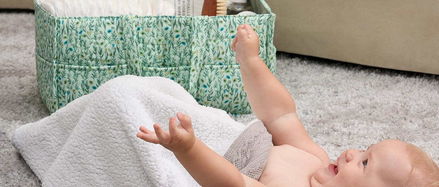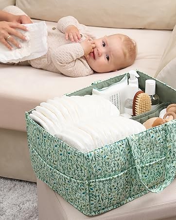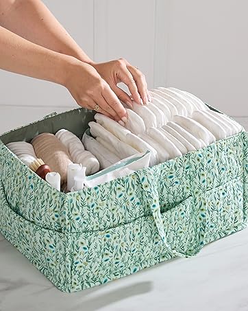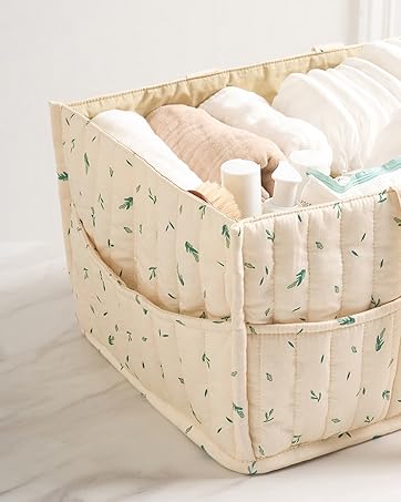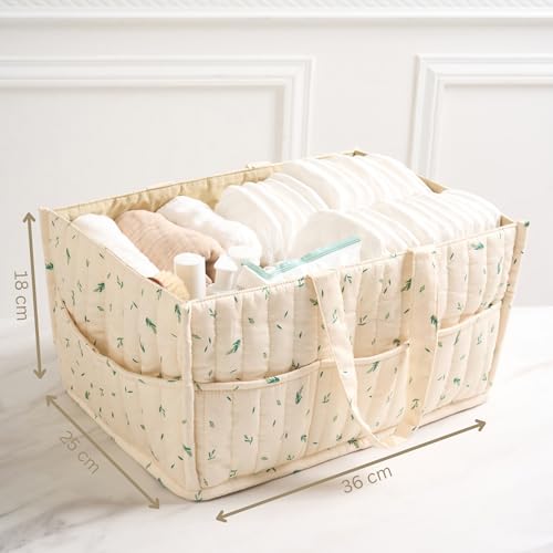 Practical Details: Dimensions: 36cm (L) x 25cm (W) x 18cm (H) – large enough to store newborn baby essentials Material: Organic cotton fabric Weight: Lightweight and portable for everyday use Storage: This diaper caddy fits nappies, nappy bags, baby hair brush, wipes, creams, breast pump parts, toys, snacks, and more Use It Anywhere: Nursery, baby changing station, next to your moses basket, living room, car, garden, or while travelling Care Instructions: Spot clean with mild soap and water