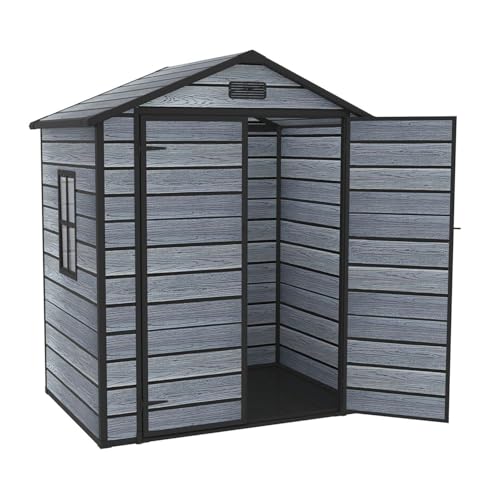 BIRCHTREE 6X4.4FT Plastic Garden Shed with Floor Apex Roof Wood Grain Effect Fade Free All Weather Resistant Lockable Door Outdoor Storage Box Air Vent&Window Garden Tool Shed Low Maintenance Grey