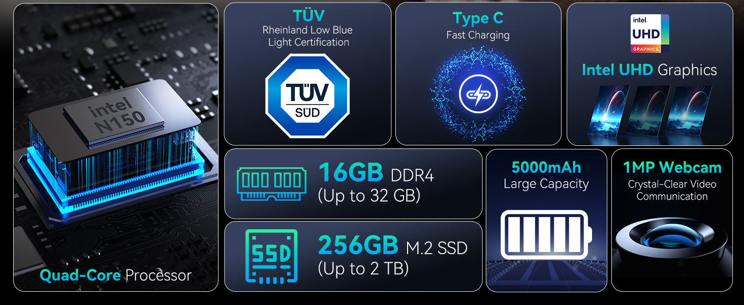 Merchant video- 【Powerful Performance】 The Blackview Acebook6 laptop is powered by the 2025 Intel N150 processor (4 cores, up to 3.6GHz, 6MB Cache), engineered for real-world speed and efficiency. With Intel 10nm ultra efficient architecture, it delivers 20% faster multitasking and graphics performance than N4020/J4005/J4105/N5095/N95/N97/N100 laptops. The laptop computer effortlessly handles office tasks, online classes, and streaming. The 6W low-power design ensures long battery life while running cool and quiet, eliminating lag. Ideal for business professionals and students.