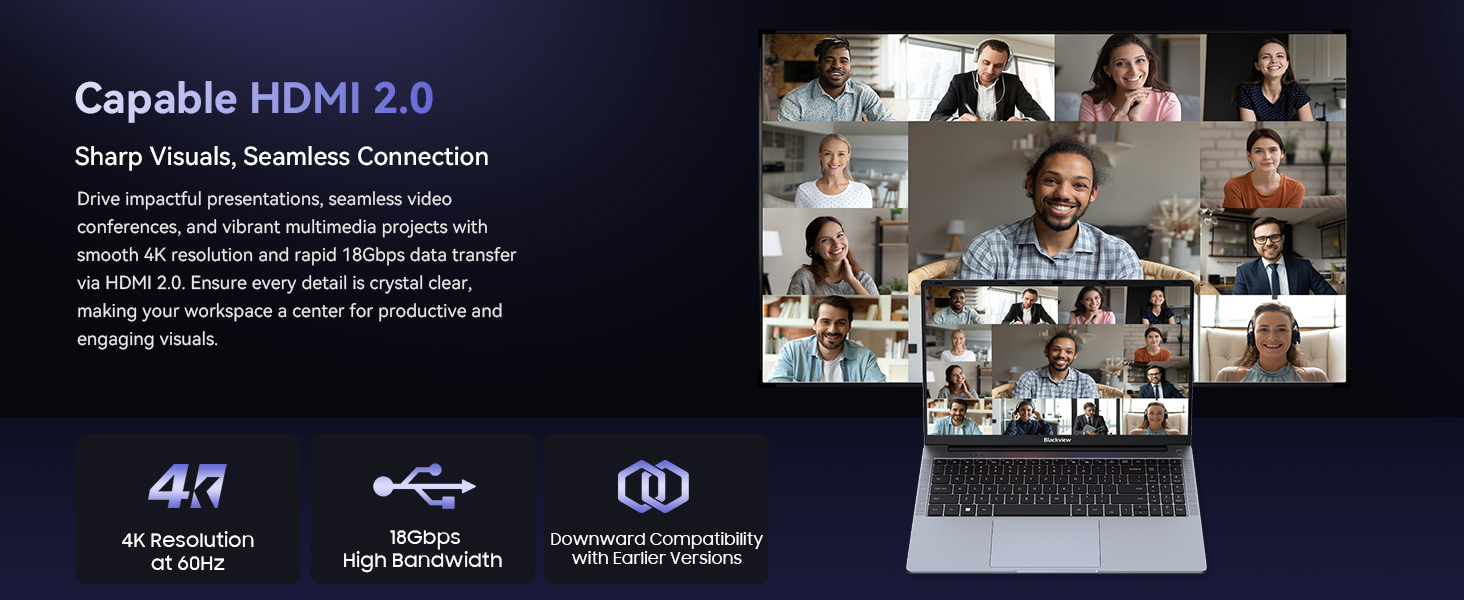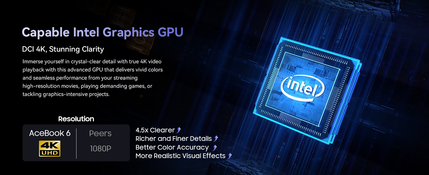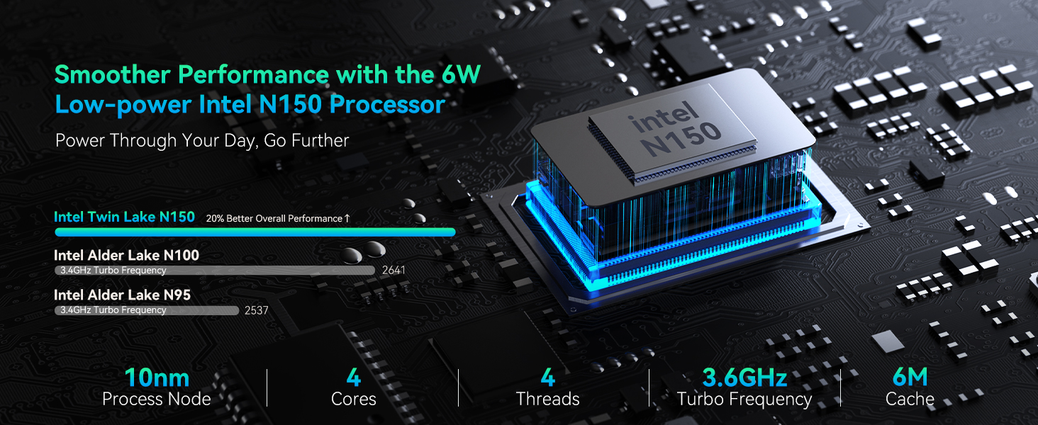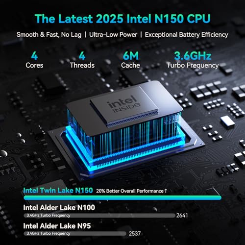 Merchant video- 【Powerful Performance】 The Blackview Acebook6 laptop is powered by the 2025 Intel N150 processor (4 cores, up to 3.6GHz, 6MB Cache), engineered for real-world speed and efficiency. With Intel 10nm ultra efficient architecture, it delivers 20% faster multitasking and graphics performance than N4020/J4005/J4105/N5095/N95/N97/N100 laptops. The laptop computer effortlessly handles office tasks, online classes, and streaming. The 6W low-power design ensures long battery life while running cool and quiet, eliminating lag. Ideal for business professionals and students.