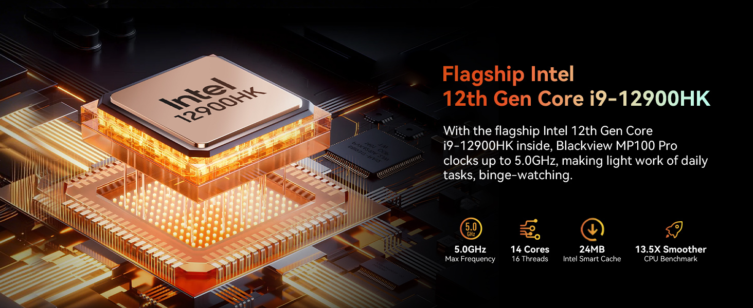 - [Unmatched Intel i9 Power for Demanding Workloads & Gaming] Experience true desktop-level performance packed into a compact design with the Blackview MP100 Pro Mini PC. At its heart lies the formidable Intel i9-12900HK processor, boasting 14 cores and 20 threads with Intel Turbo Boost Technology reaching up to 5.0GHz. This Desktop pc makes it significantly more powerful than common N100 or N150-based systems, providing seamless performance for intensive tasks like 4K video editing, 3D rendering, hardcore gaming, and heavy multitasking. It's the ultimate all-in-one solution for professionals and gamers who refuse to compromise on speed and responsiveness.
