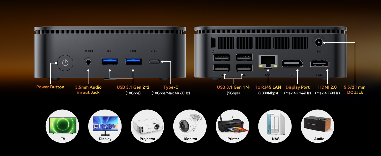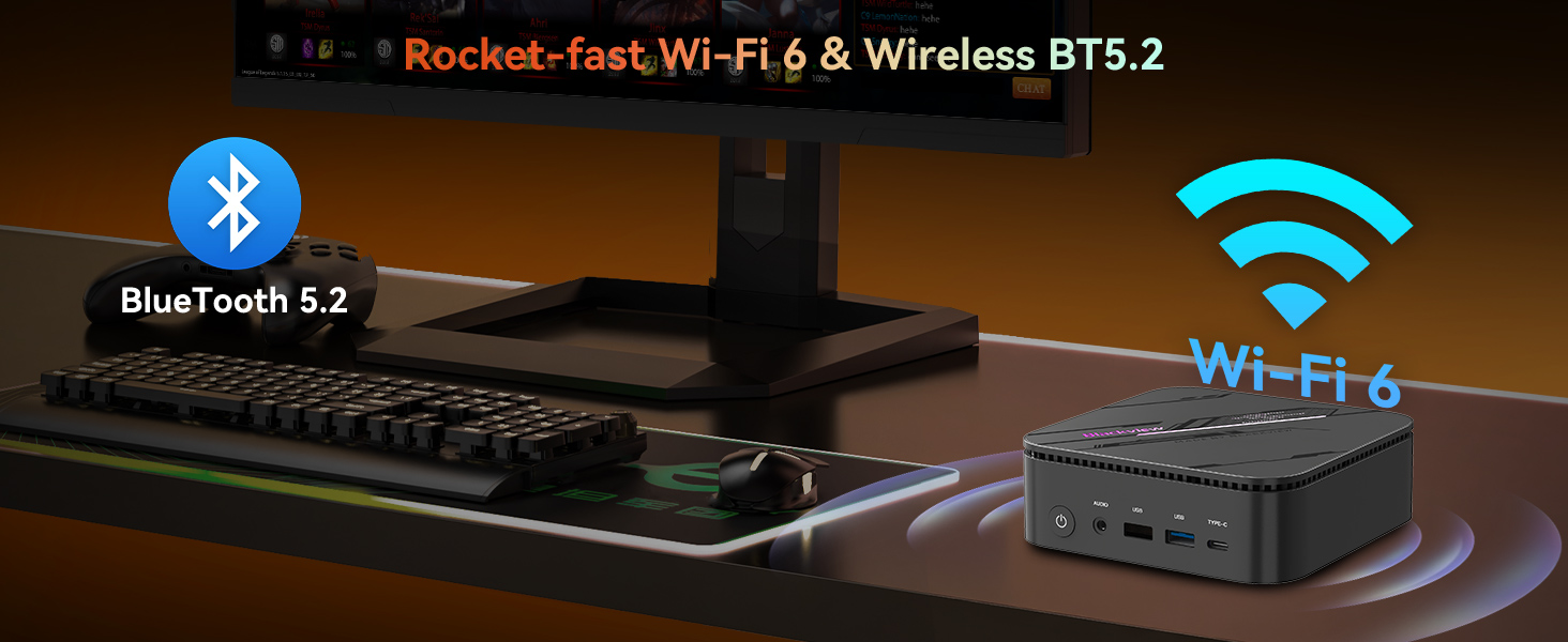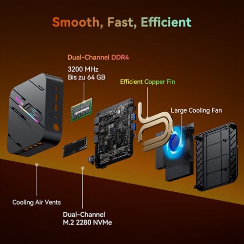 - [Superfast Connectivity with Dual LAN & Wi-Fi 6] Designed for speed and reliability, this mini PC comes equipped with dual Gigabit Ethernet ports for wired network redundancy or link aggregation, ensuring ultra-stable connections for online gaming, streaming, or large file transfers. With Wi-Fi 6 and Bluetooth 5.2, you also get blazing-fast wireless speeds and superior device connectivity. Multiple USB ports including USB 3.1 Gen2 (10Gbps) offer expansive peripheral support, making it perfect for docking stations, external storage, VR setups, and more.