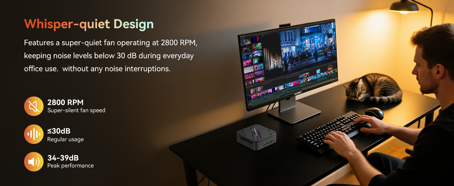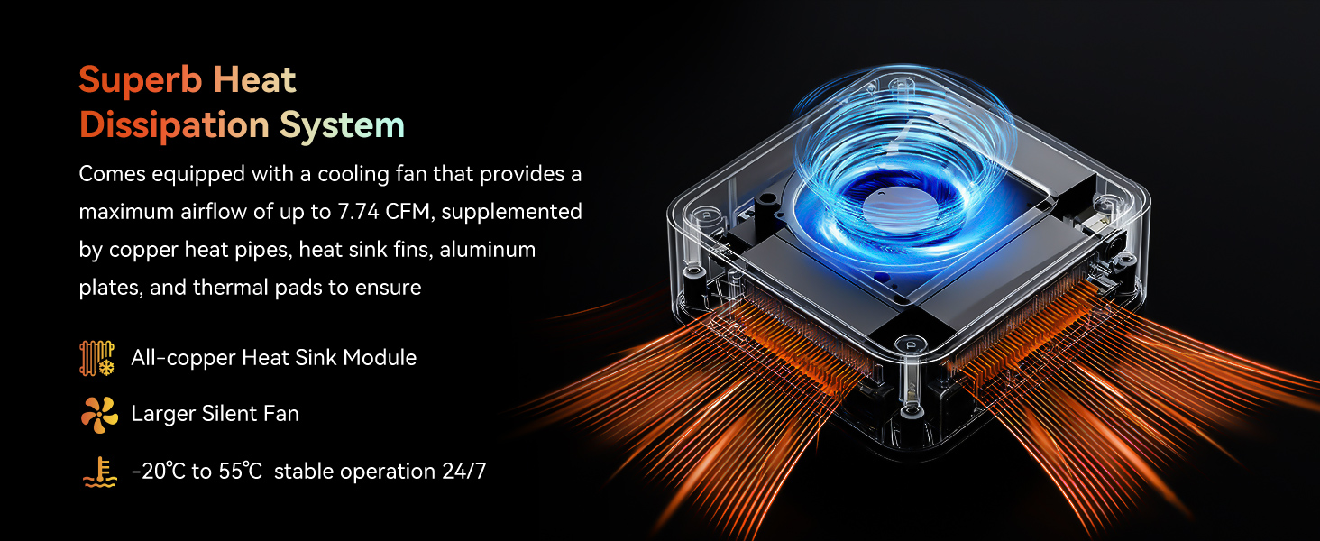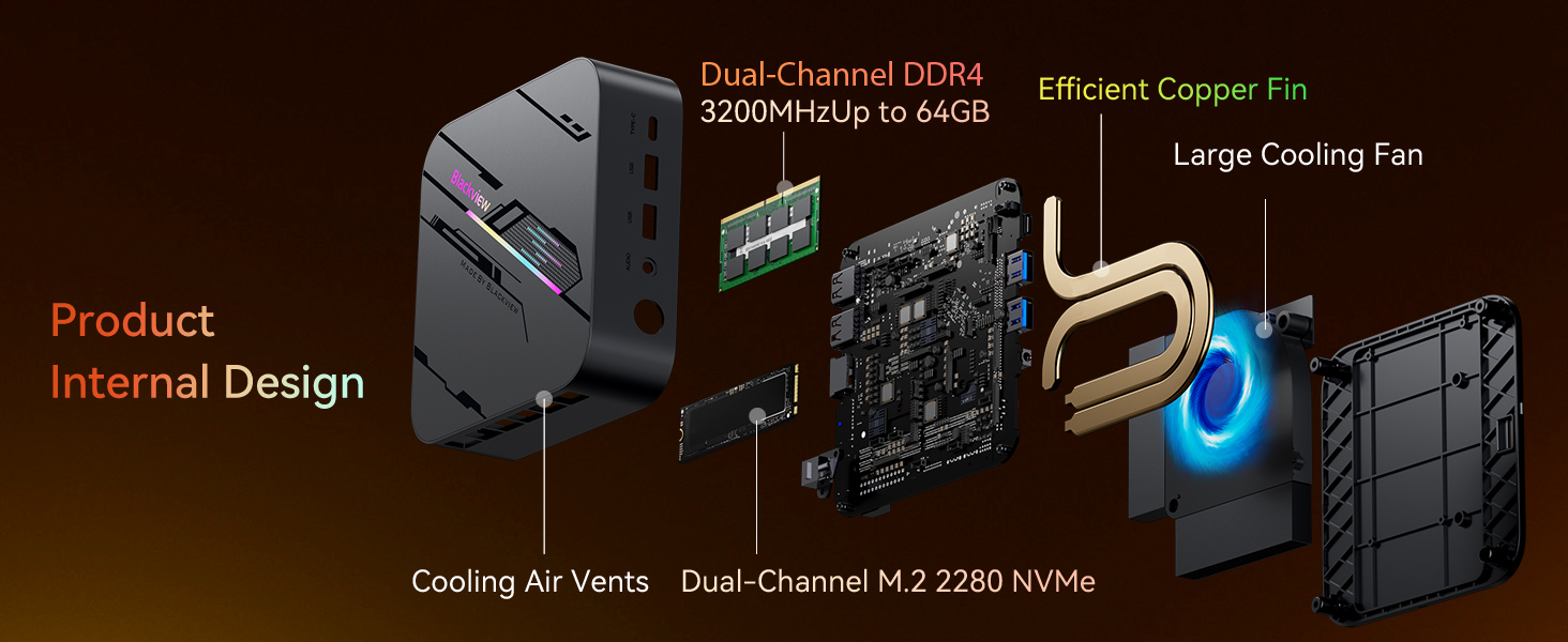 - [Advanced Cooling System for Sustained High Performance] Don’t let its small size fool you—the MP100 Pro micro pc is built to stay cool under pressure. An innovative thermal design featuring copper heat pipes, aluminium fins, and a quiet fan ensures efficient heat dissipation even during extended gaming sessions or CPU-intensive workloads. This means consistent peak performance without thermal throttling or excessive noise. Enjoy a silent yet powerful computing experience, whether you’re working in a quiet home office or immersed in an all-night gaming marathon.