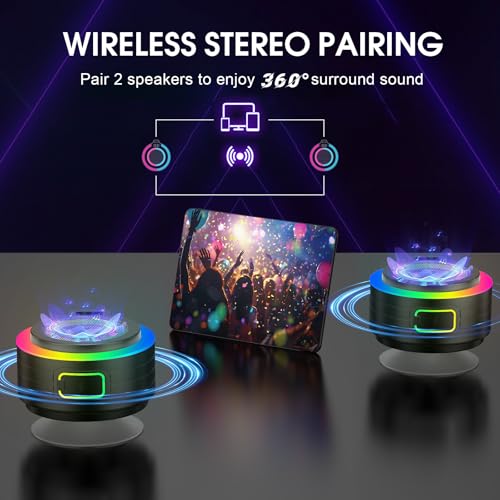 - Colorful Light Show and Portable Designand: Shower speaker bluetooth waterproof, not only a music speaker, but also a unique night theme colorful lights, The brilliant light show makes it a night elf, a great partner for parties and travel. Its compact size and lightweight construction make it easy to carry, ensuring you can enjoy music anytime, anywhere. Whether you're on outdoor adventures, traveling, or relaxing at home, it can cater to your music needs.