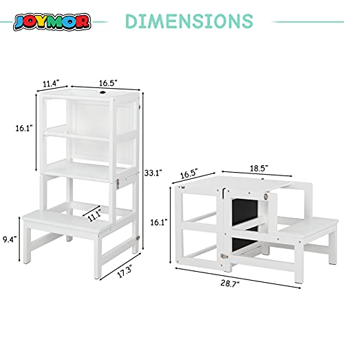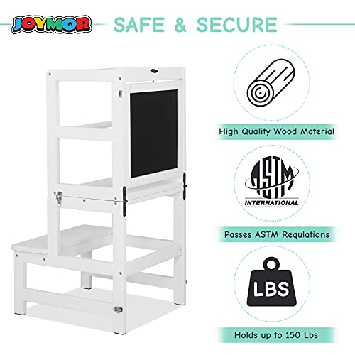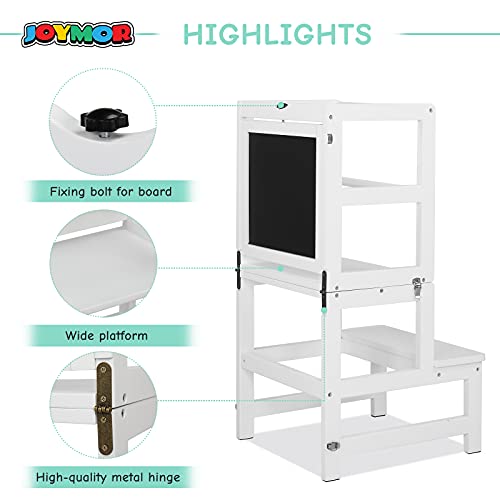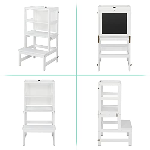 Bonnlo Kids Standing Tower, 4-in-1 Wooden Children Learning Standing Tower for Kitchen Counter, Foldable Stool with Safety Rail, Chalkboard (White)