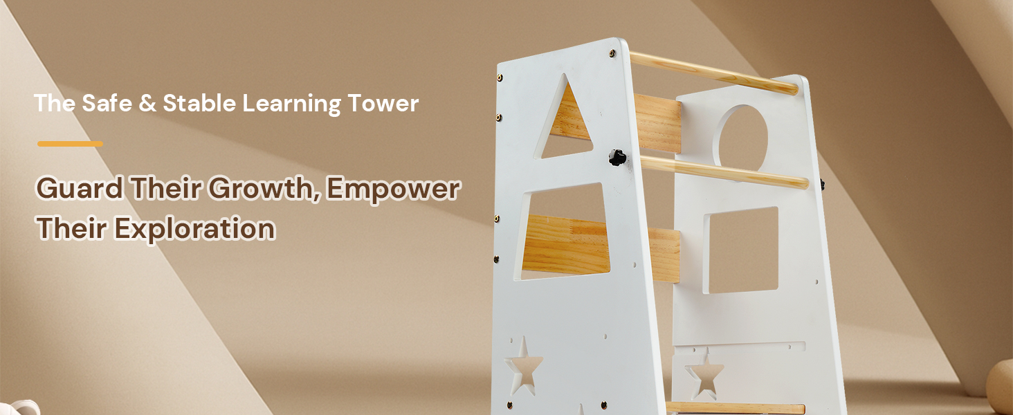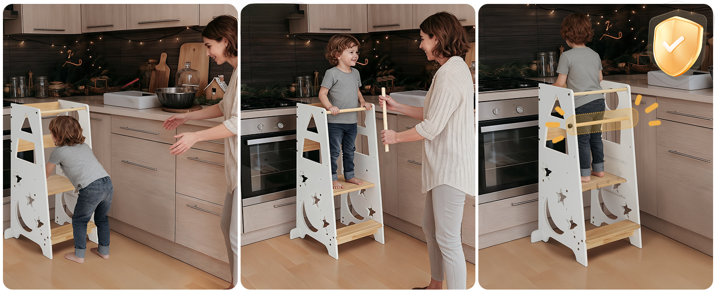 [Educational Engagement Design]: The geometric and moon-shaped cutouts serve as both safety handrails and learning tools, helping children develop pattern recognition while encouraging participation in household activities and practical life skills.