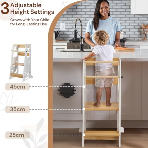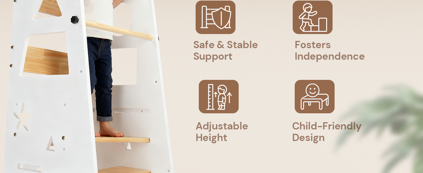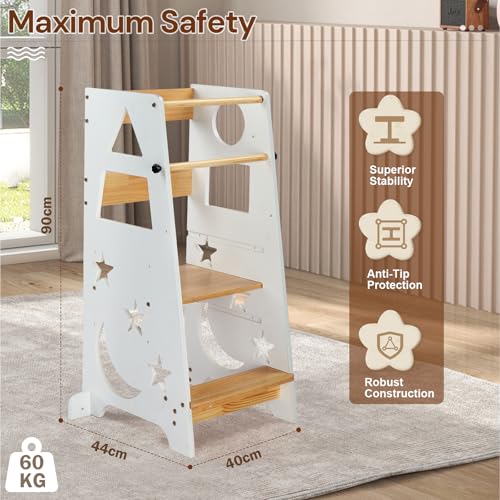 [3-Level Adjustable Learning Tower]: This three-level adjustable kitchen standing tower is designed for children of different heights. With a maximum load capacity of 60 kg, it is suitable for children from 1.5 years and up, growing with your child as a long-term family investment.