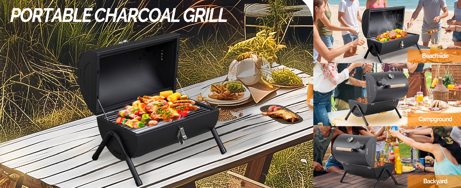 [Tough Anti-Slip Base]: Thickened steel body and rubber feet stand firm on grass, sand or patio, so your portable charcoal bbq stays put while you flip, baste and sip—durable enough for endless summers of alfresco feasts.