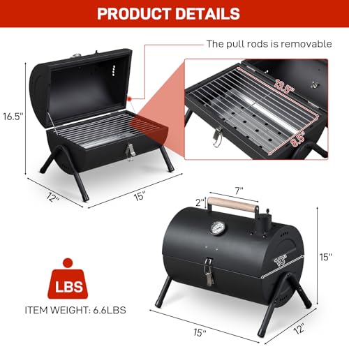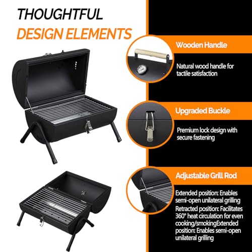 [Built-In Thermometer]: Monitor heat at a glance and cook steaks, skewers or salmon fillets to juicy perfection—no need to lift the lid and lose precious smoke on this compact barrel charcoal bbq. [Precision Airflow]: Side vents plus adjustable top chimney give Weber-portable-bbq-level control over temperature and smoke, turning the grill into one of the tastiest outdoor barbecues & smokers in its class.