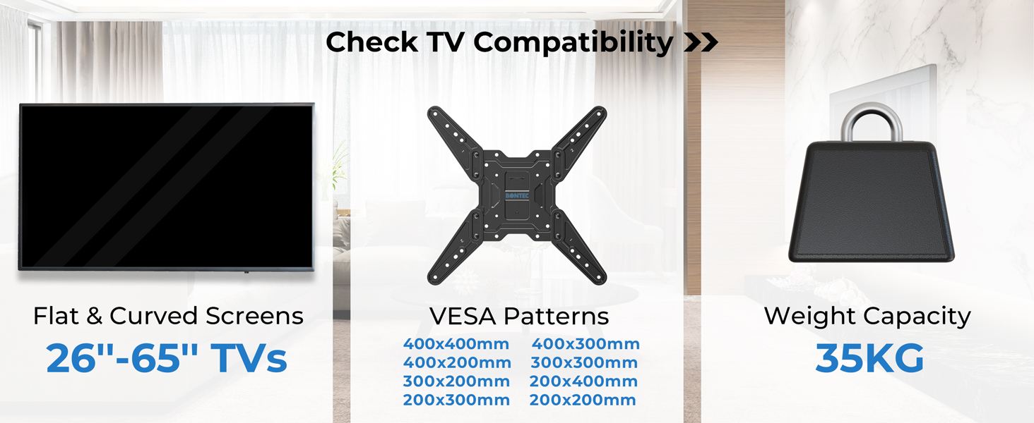 - ✅ UNIVERSAL COMPATIBILITY – This universal tv wall bracket fits 26–65 inch LED, LCD and OLED flat or curved screens, including 32 inch tv wall bracket and tv bracket 55 inch, supporting 35kg with VESA wall mount patterns from 200x200mm to 400x400mm, suitable for concrete, brick and wood stud walls