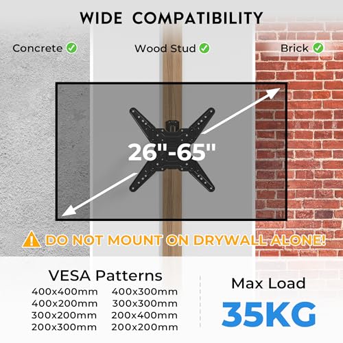 - ✅ UNIVERSAL COMPATIBILITY – This universal tv wall bracket fits 26–65 inch LED, LCD and OLED flat or curved screens, including 32 inch tv wall bracket and tv bracket 55 inch, supporting 35kg with VESA wall mount patterns from 200x200mm to 400x400mm, suitable for concrete, brick and wood stud walls