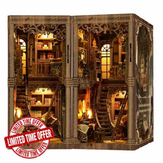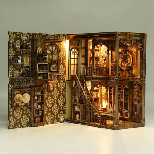 Book Nook Kit – (Deluxe Edition) – DIY Miniature Wooden Puzzle | Vintage Library Scene with LED Lights | 3D Bookend Dollhouse for Bookshelf Decoration | Creative Home Déco