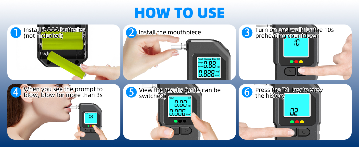 Blow into the mouthpiece for 4 to 5 seconds, wait 3 seconds, and the alcohol concentration will appear on the screen.