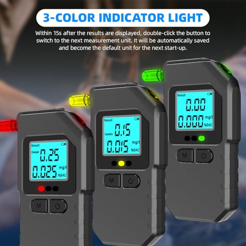 Easy to Use: The breathalysers are simple to operate. Insert 3 1.5V AAA batteries (not included), align your mouth with the breath port, blow for over 3 seconds, then wait patiently for 3 seconds, and the alcohol concentration will be displayed on the screen. This alcohol tester breathalyzer is equipped with intelligent detection functionality, displaying different colours and warnings based on alcohol concentration, enabling you to understand the measurement results more intuitively and safely.