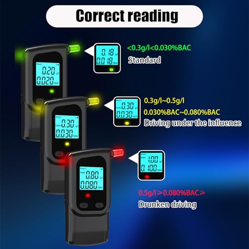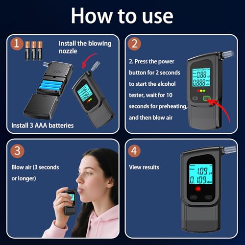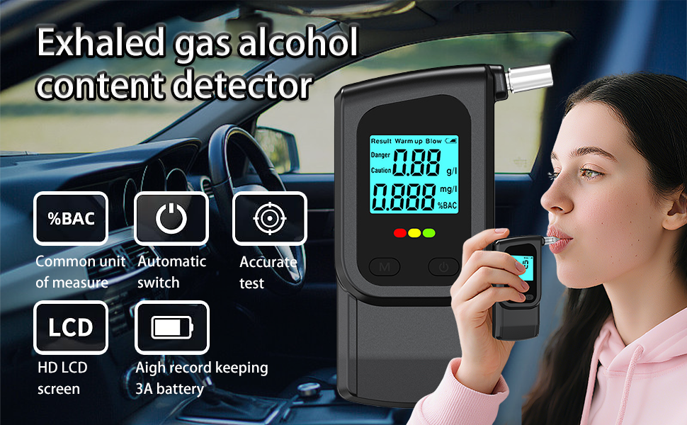 【Easy to use】Just insert the 3* AAA batteries, then need to press the button for seconds to start, and 10 seconds to warm up, then blow for 3-5 seconds, the result will be shown on the LCD screen later, and display two units of measurement at the same time – %BAC, g /l.